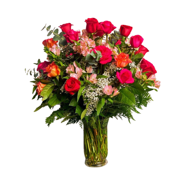 Elegante florero en 12 rosas importadas, astromelias y variedad de verdes.