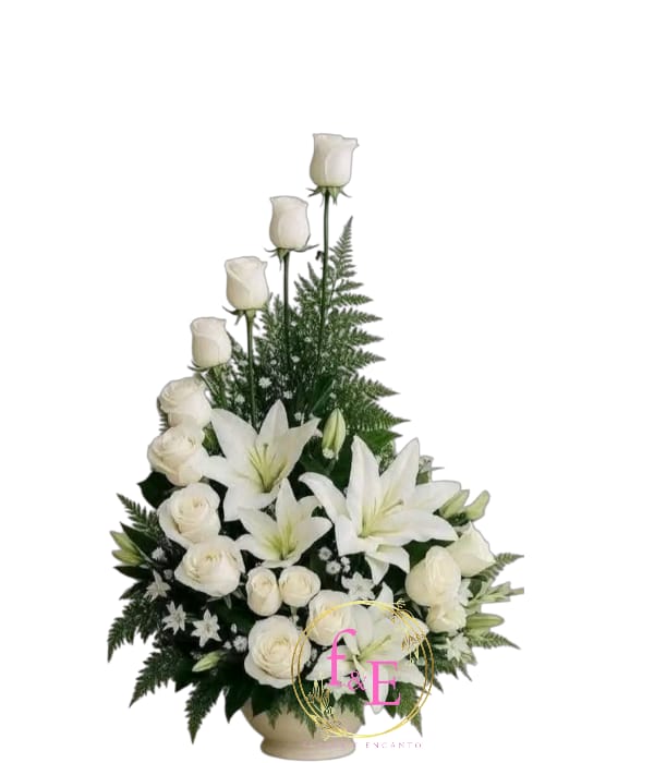 Arreglo fúnebre media luna de esperanza, elaborado con 14 rosas blancas que transmiten pureza y serenidad, acompañadas de delicados lilium que aportan elegancia y luz. El follaje de temporada enmarca suavemente la composición, creando un diseño armónico y significativo, ideal para expresar respeto, consuelo y un último adiós lleno de sensibilidad.