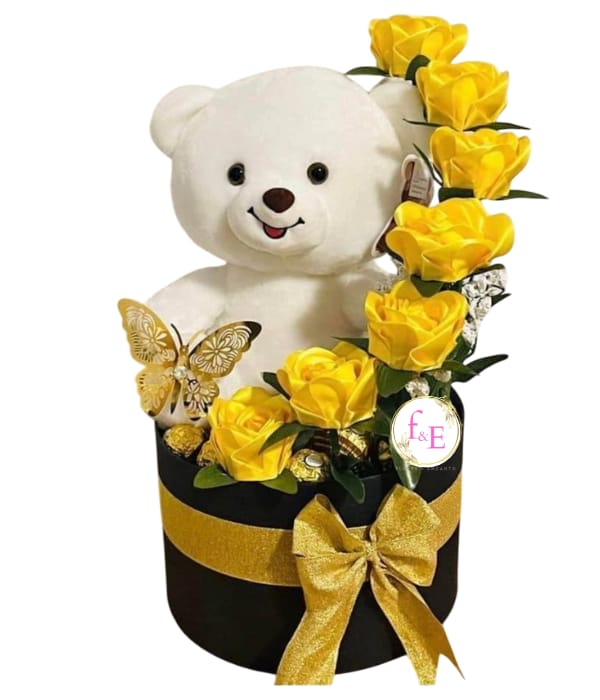 Encantador box circular que combina 7 rosas amarillas de jabón, delicadamente elaboradas para mantener su belleza intacta, con un peluche de 25 cm, creando un regalo dulce y lleno de ternura. Presentado con cuidado y estilo, este detalle es perfecto para sorprender y transmitir alegría, cariño y afecto en cualquier ocasión.