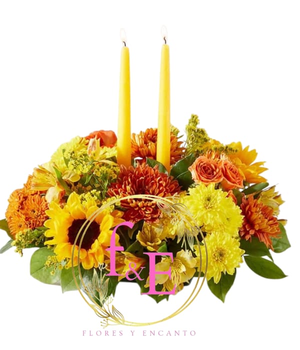 Centro de mesa navideño con dos velas al centro, rodeadas de 2 girasoles radiantes y flores de temporada. Diseñado para dar calidez y color a las celebraciones, aportando un toque festivo con elegancia. Perfecto para acompañar la cena de Navidad, decorar espacios familiares o regalar en estas fechas especiales