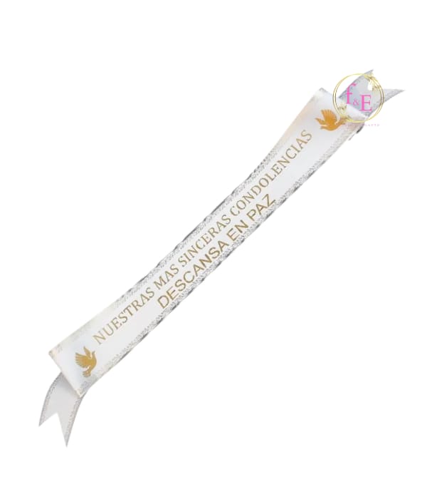 Esta cinta está confeccionada con raso o satén de alta calidad, brindando una textura suave y un acabado digno para acompañar su corona o arreglo floral. Diseñada para portar un mensaje breve y sincero que honre la memoria del ser querido. Ofrecemos impresión clara y solemne para garantizar la legibilidad y la perdurabilidad del mensaje. Es la forma más tradicional y emotiva de transmitir su condolencia y respeto final.