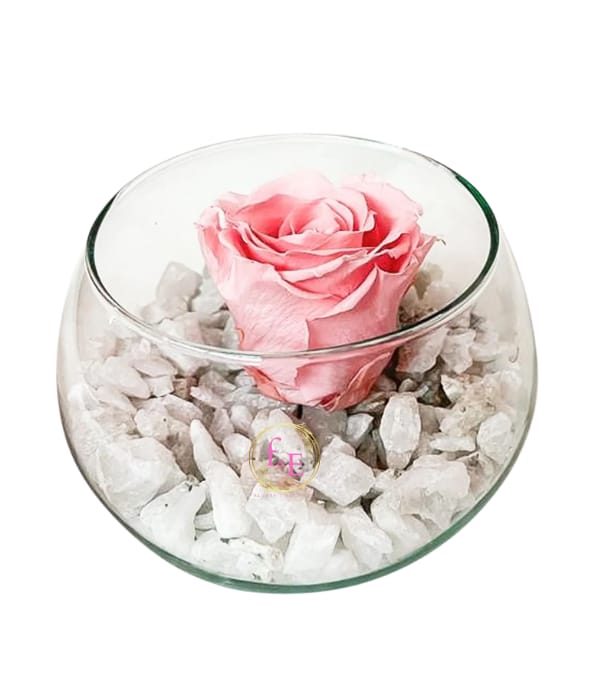 Delicada rosa preservada en tono rosado, presentada dentro de una elegante pecera de cristal. Acompañada de finas piedras decorativas que realzan su belleza y dan un toque moderno y sofisticado. Un detalle eterno que simboliza amor duradero, perfecto para sorprender y decorar con estilo cualquier espacio.”