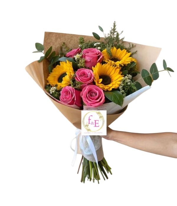 Un radiante ramo compuesto por 3 girasoles luminosos y 5 rosas rosadas de intenso color, creando un contraste vibrante y lleno de energía. El arreglo se complementa con follaje de temporada, que aporta frescura, textura y equilibrio visual. Cada flor es cuidadosamente seleccionada para lograr una composición armoniosa y llamativa, ideal para transmitir alegría, cariño y fuerza en cualquier ocasión especial.