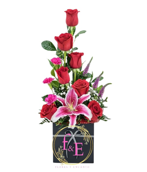 Encantador jardín de estación en caja, con 7 elegantes rosas rojas acompañadas de 1 lilium de imponente apertura y un delicado follaje de temporada que realza cada detalle. Un arreglo moderno, romántico y lleno de estilo, perfecto para sorprender con un gesto único y significativo.