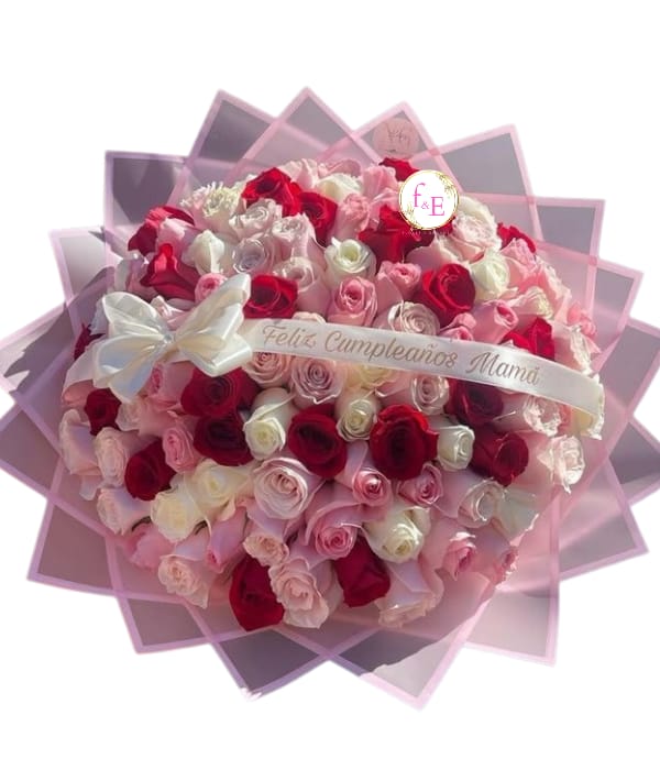 Ramo buchón de 75 rosas en tonos blanco, rojo y rosado, creado en una composición abundante y armoniosa que resalta la belleza de cada color. Presentado con una fina cinta personalizada que añade un detalle único y especial. Un ramo imponente, romántico y lleno de significado, ideal para sorprender y expresar emociones profundas.”