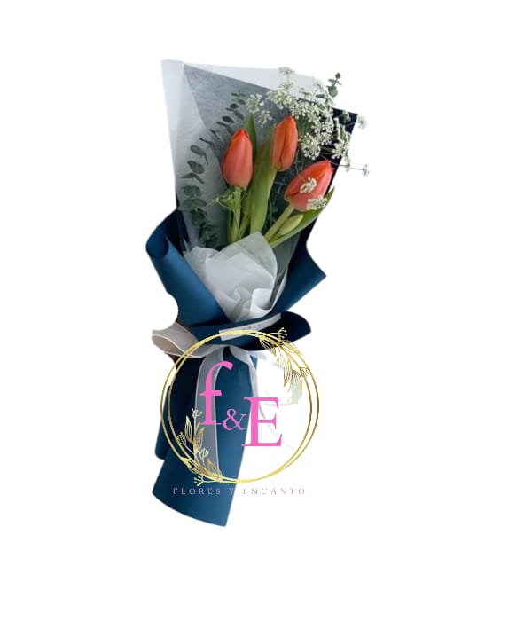 Un delicado ramo de tulipanes en calidez, compuesto por 3 tulipanes naranjos de pétalos vibrantes, acompañados de follaje de temporada que aporta frescura y volumen natural. Presentado en una envoltura fina y armónica, este arreglo destaca por su estilo moderno y lleno de luminosidad, ideal para sorprender con un detalle cálido y lleno de vida.