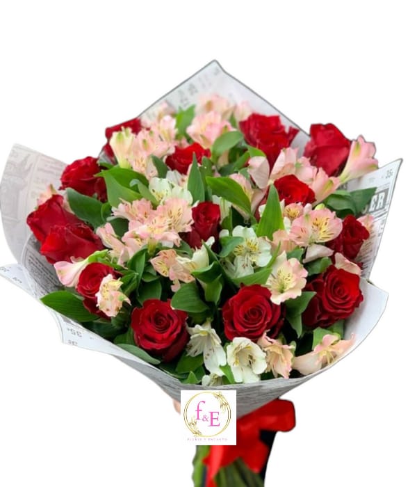 Ramo elegante compuesto por 14 rosas rojas de tallo largo acompañadas de delicadas astromelias en tonos blanco y rosado. Armonizado con follaje fresco y una linda envoltura decorativa, logrando un detalle romántico y sofisticado para sorprender en cualquier ocasión especial.
