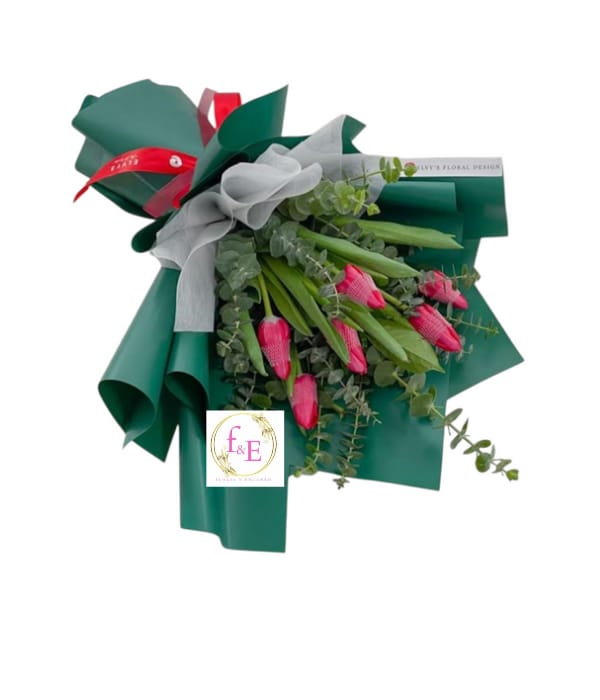 Un encantador ramo encanto fucsia en envoltura deluxe, 6 tulipanes fucsia, vibrantes y llenos de energía, acompañados de eucalipto fresco que aporta textura, aroma y un toque natural. Cada tallo es cuidadosamente seleccionado y dispuesto en una linda envoltura que realza la elegancia del diseño, creando un detalle moderno, delicado y perfecto para iluminar cualquier momento especial.