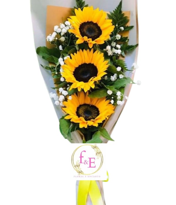 Ramo golden glow de 3 girasoles vibrantes acompañados de follaje de temporada, formando un diseño fresco y luminoso. Presentado con una linda envoltura que realza sus tonos dorados, creando un detalle alegre, radiante y perfecto para iluminar cualquier momento.