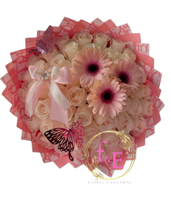Ramo primavera romántica,Un arreglo floral lleno de romanticismo y delicadeza. Este hermoso ramo está compuesto por 50 finas rosas en tonos marfil cuidadosamente distribuidas para crear una forma redonda y armoniosa. Tres gerberas rosadas en el centro aportan frescura, contraste y un toque moderno que realza la composición.