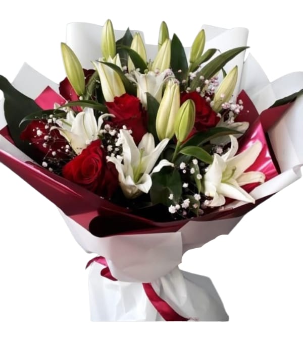 Ramo compuesto por 5 rosas rojas y lilium blanco, complementados con follaje de temporada que realza su frescura y textura. La intensidad de las rosas rojas se equilibra con la pureza del lilium, creando un arreglo elegante, romántico y armonioso. Perfecto para expresar amor, admiración o celebrar momentos especiales con un toque clásico y sofisticado.